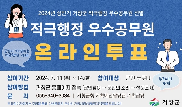 경남 거창군은 올 상반기 적극행정 우수사례 및 우수공무원을 선발하기 위해 오는 14일까지 군청 홈페이지에서 군민 대상 온라인 투표를 진행한다고 11일 밝혔다.