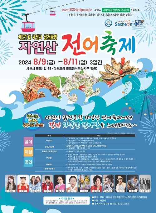 여름 전어의 맛을 느낄 수 있는 '제21회 사천시 삼천포항 자연산 전어축제'가 8월 9일부터 11일까지 삼천포항 팔포음식특화지구 일원에서 열린다.