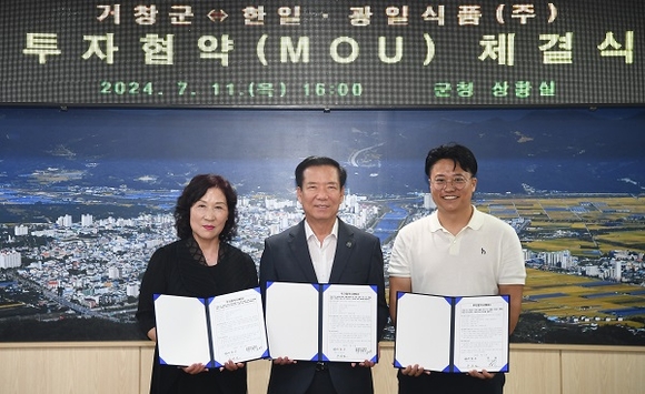 경남 거창군은 지난 11일 군청 상황실에서 구인모 군수, 백종길 한일 대표, 손유자 농업회사법인광일식품(주) 대표와 관계자가 참석한 가운데 두 기업과 투자협약을 체결했다.