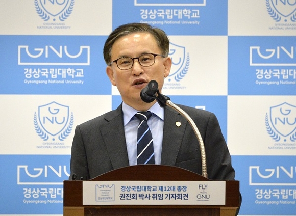 권진회 경상국립대학교 총장이 18일 오후 가좌캠퍼스 박물관 1층 대강당에서 취임 기자회견을 갖고 대학 발전 비전과 구체적인 실행 계획을 발표했다.