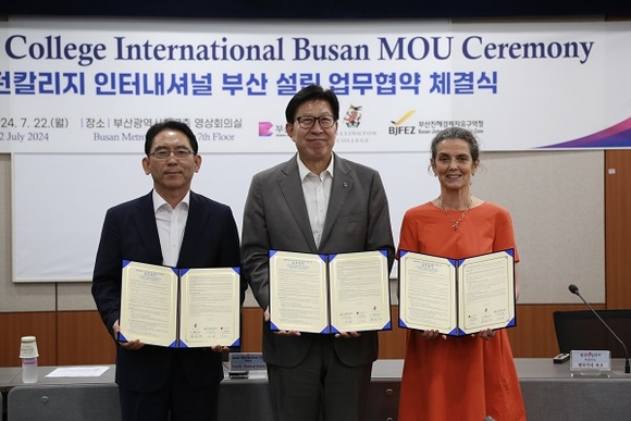 부산진해경제자유구역청이 22일 부산시청 7층 국제의전실에서 부산시, 영국 웰링턴칼리지와 명지국제신도시 내 웰링턴칼리지 부산캠퍼스 설립을 위한 업무협약을 체결했다고 밝혔다.