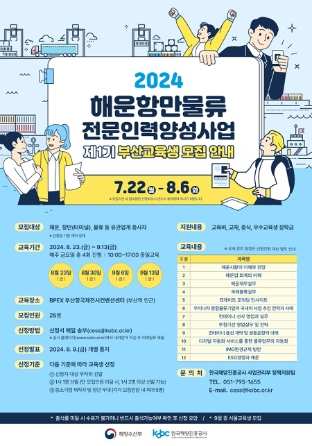 한국해양진흥공사가 22일부터 8월 6일까지 '2024년 해운항만물류 전문인력 양성사업' 부산 교육생 모집을 시작한다고 밝혔다.