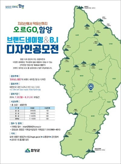 국민 누구나 참여할 수 있는 이번 공모전은 '오르GO, 함양'의 브랜드 네이밍과 이미지(BI·브랜드 아이덴티티) 및 응용 디자인 등을 공모하며, 모두 9점을 선정할 예정으로 금상 1점 200만 원, 은상 1점 100만 원, 동상 2점 각 50만 원, 장려상 5점 각 10만 원 등 총상금 450만 원 규모다.