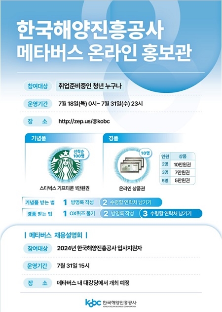 한국해양진흥공사가 채용 정보에 대한 구직자들의 접근성 제고를 위해 시공간 제약에서 벗어난 ‘메타버스 채용 플랫폼’을 오는 31일까지 운영할 예정이라고 밝혔다.