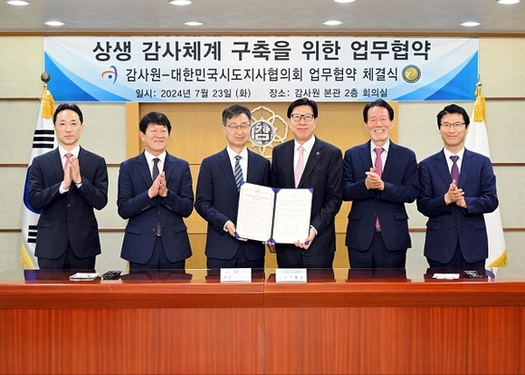 대한민국시도지사협의회가 23일 감사원 대회의실에서 감사원과 지방자치단체의 자체감사기구 역량 강화 등 효율적인 상생 감사체계 구축을 위한 구체적인 협력방안이 담긴 업무협약을 체결했다고 밝혔다.
