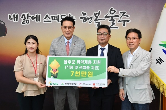 S-OIL이 지난 22일 울주군청 군수실에서 성금 7천만 원을 전달했다. 전달식에는 이순걸 울주군수, S-OIL 김태기 본부장, (사)울주군자원봉사센터 손덕현 이사장, 사회복지공동모금회 울산지회 양호영 사무처장 등 관계자들이 참석했다.