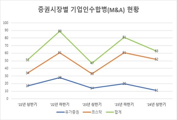 23일 예탁결제원은 유가증권시장법인 11개사와 코스닥시장법인 52개사가 상반기에 M&A를 진행했다고 밝혔다.