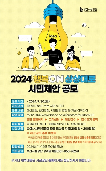 부산시설공단이 오는 9월 30일까지 공단과 관련한 시민 체감형 개선 아이디어를 공모한다고 밝혔다.