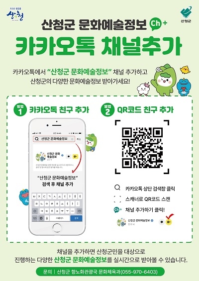 권순혁 산청군 문화체육과장은“쉽고 간편한 방법으로 공연, 축제, 행사 등 문화예술 소식을 알리기 위해 카카오톡 채널을 개설했다”며 “문화예술 관련 홍보 채널 운영을 통해 다양한 사람들이 시공간의 제약 없이 문화예술에 대한 정보를 제공받길 기대한다”고 말했다.