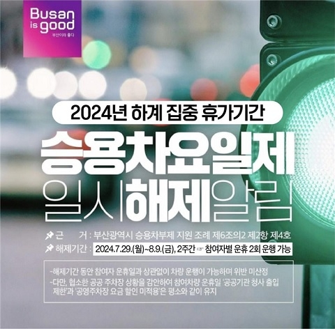 부산시가 집중 하계휴가 기간, 승용차요일제 참여자의 편의 제공을 위해 29일부터 8월 9일까지 승용차요일제를 일시 해제한다고 밝혔다.