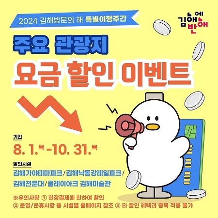 할인 기간은 8월 1일부터 10월 31일까지이며, 대상시설은 대표 관광시설인 김해가야테마파크, 김해낙동강레일파크, 김해천문대, 클레이아크 김해미술관 총 4곳으로 입장료, 체험료 등을 평균 20~30% 할인한다.