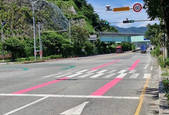 이번 공사에서는 신항에서 가주터널 방향으로 빠져나가는 차량들이 쉽게 인식할 수 있도록 분홍색 컬러 유도선을 설치하고, 잦은 통행으로 인해 마모된 정지선을 다시 도색했다.