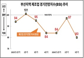 부산상공회의소는 31일 지역 제조기업 252개사를 대상으로 실시한 ‘2024년 3/4분기 부산지역 제조업 경기전망지수(BSI) 조사’를 발표했다. BSI는 기준치 ‘100’을 기준으로 100 이상이면 경기 호전을, 미만이면 경기 악화를 의미한다. 조사 결과에 따르면, 2024년 3분기 제조업 경기전망지수(BSI)는 ‘80’을 기록했다. 이는 직전 분기인 2분기 전망치(97)에 비해 크게 하락한 수치로, 5분기 연속으로 경기부진 전망이 이어지고 있다. 이러한 하락은 고금리, 고물가 등의 3고 현상 지속과 지정학적 리스크 장기화, 중국산 저가 제품의 과잉 공급 등 복합적 리스크로 인해 기업 현장의 어려움이 가중된 결과로 풀이된다.