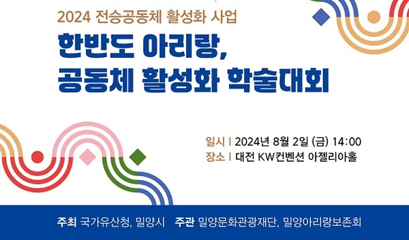 밀양문화관광재단과 밀양아리랑보존회는 오는 8월 2일 오후 2시 대전 KW컨벤션센터에서 '한반도 아리랑 공동체 활성화 학술대회'를 개최한다고 31일 밝혔다.