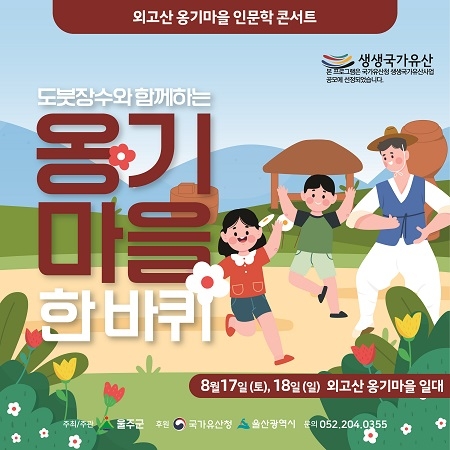 울산시 울주군이 여름방학 기간인 8월을 맞아 외고산 옹기마을에서 온 가족이 함께 즐기는 ‘도붓장수와 함께하는 옹기마을 한 바퀴’ 인문학콘서트를 개최한다고 31일 밝혔다.