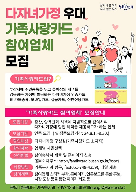 부산 해운대구가 다자녀가정의 양육 부담을 줄이기 위해 ‘다자녀가정 우대 가족사랑카드 참여업체’를 모집한다. 모집 기간은 9월까지이다.