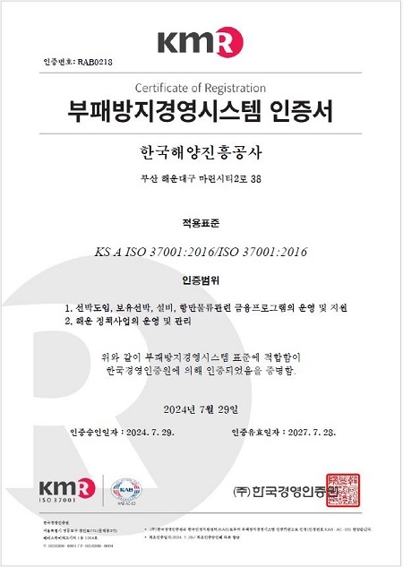 한국해양진흥공사가 지난 달 29일 한국경영인증원(KMR)으로부터 부패방지경영시스템(ISO 37001) 인증을 취득했다고 밝혔다.