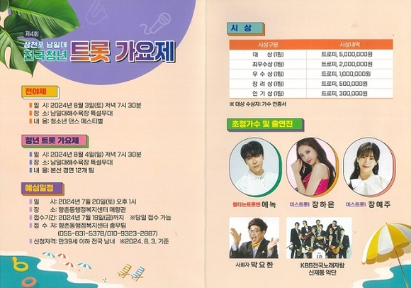 정영춘 추진위원장은 “올해 가요제에서 경연을 펼치는 청년들의 실력이 어느 해보다 뛰어나다. 사천의 대표 관광지인 남일대를 찾아 수준 높은 트롯 공연과 삼천포 밤바다의 낭만을 즐기시길 바란다”고 말했다.