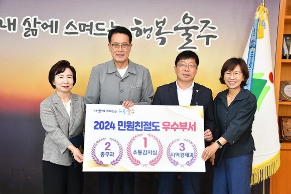 울주군은 이번 조사 결과를 바탕으로 친절도 우수부서로 선정된 소통감사실(1위), 총무과(2위), 지역경제과(3위)를 대상으로 이날 시상식을 가졌다.