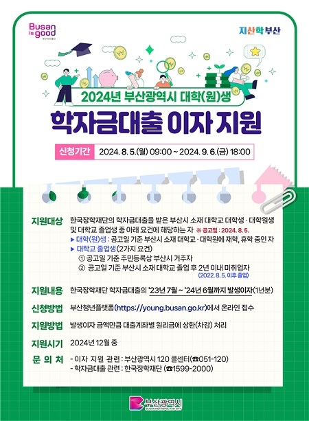 부산시가 '2024년 대학(원)생 학자금대출 이자지원 사업' 신청자를 모집한다고 밝혔다. 시는 지난 2016년부터 학자금대출을 받은 학생들의 경제적 부담을 낮추기 위해 대출이자를 지원하고 있다.