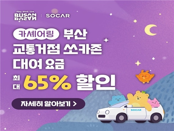 부산관광공사가 여름 휴가 시즌을 맞아 쏘카와 함께 8월에서 10월 간 최대 65% 할인 ‘별바다부산 카셰어링’ 프로모션을 진행한다고 밝혔다.