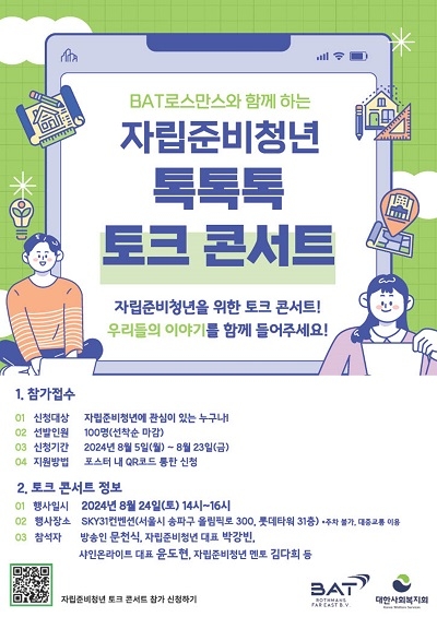 이번 토크 콘서트는 자립준비를 하고 있는 청년들과 이 분야에 관심을 가진 모든 사람들을 대상으로 하며, 24일 서울 송파구 SKY31 컨벤션에서 개최된다. 참가 신청은 8월 23일까지 대한사회복지회 공식 홈페이지를 통해 가능하다.