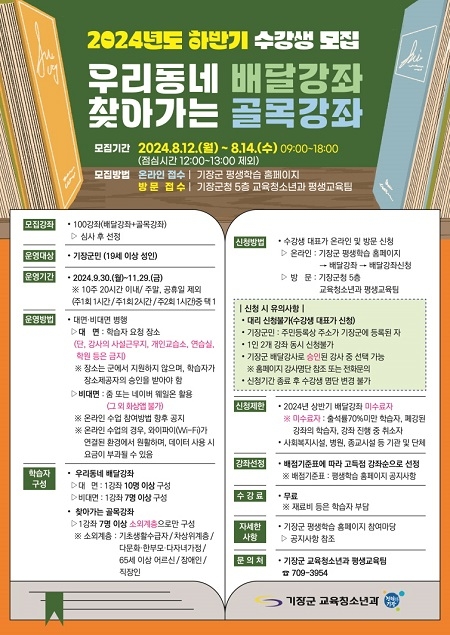 부산 기장군이 오는 12일부터 14일까지 2024년 하반기 ‘우리동네 배달강좌’ 및 ‘찾아가는 골목강좌’ 수강생을 모집한다고 5일 밝혔다.