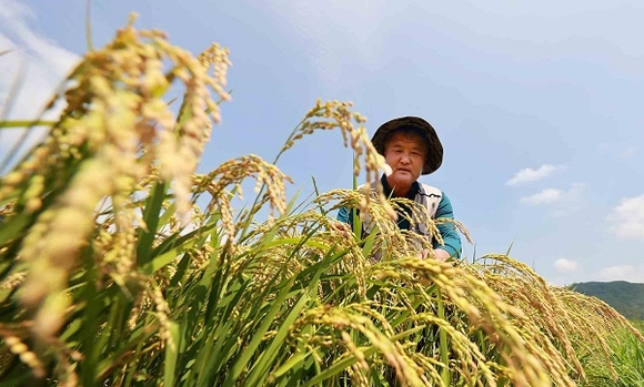절기상 가을 시작을 알리는 입추(立秋)를 이틀 앞둔 5일 경남 함양군 지곡면 마암마을 들판에서 박철우씨가 폭염에도 잘 익어가는 벼를 돌보고 있다. (사진=함양군 제공)