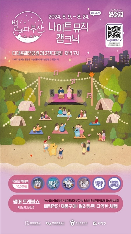 부산시가 작년에 이어 올해도 다대포 해변공원에서 '2024 별바다부산 나이트 뮤직 캠크닉'을 개최한다고 밝혔다.