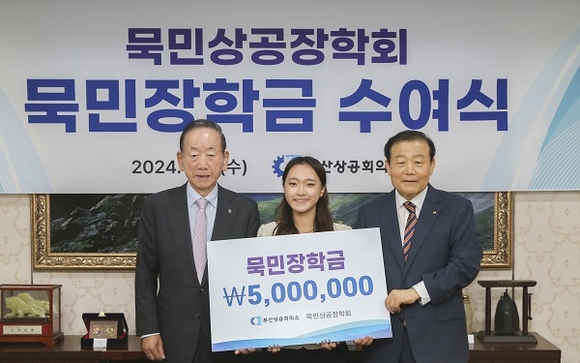부산상공회의소가 7일 ‘2024년도 묵민상공장학금 수여식’을 개최했다고 밝혔다. 올해 장학금 수상자로는 미국 아칸소 주립대 글로벌공급망관리 4학년에 재학 중인 심근영 양이 선정됐다. 이날 수여식에는 양재생 부산상의 회장과 이동건 부방그룹 회장을 비롯한 묵민상공장학회 관계자들이 참석했다.