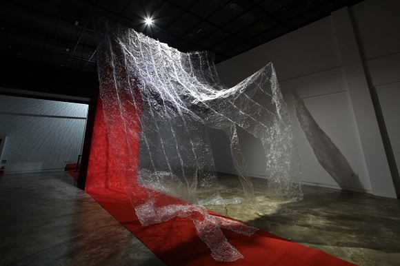 이번 전시 <생존전략: 프라이팬 위에서 춤추기>에서도 작가는 ‘과열’이라는 현상에 주목해 과열로 인한 균열의 풍경을 그려내는 한편, 자신을 포함한 존재가 살아갈 수 있게 만드는 것은 무엇인지 질문한다. 작가는 투명비닐에 열을 가해 구기거나, 주사기로 전시장 벽면을 가득 채우는 등의 작업 방식으로 설치 작품을 구성하고, 전시장 곳곳에는 작가의 생존에 대한 고민을 엿볼 수 있는 사진, 영상 작품들을 배치했다.