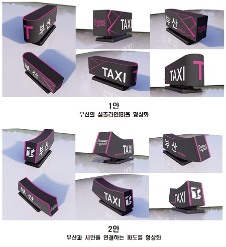 이번 선호도 조사는 2개의 디자인 후보안을 대상으로 진행되며, 두 후보안 모두 부산의 도시 브랜드 색상과 선을 부분적으로 차용해 차분하면서도 역동적인 느낌을 살렸다. 1안은 도시 브랜드 심볼 라인 ‘B’의 선과 각을 입체화해 3차원적으로 형상화한 디자인으로, ‘부산’ 택시를 상징하는 독보적인 디자인이라는 평가를 받고 있다. 2안은 부산이 지향하는 도시 계획 모델인 ‘15분 도시’에서 착안해 표시등에 15도의 기울기를 주고, 파도의 이미지를 표현해 색다른 느낌을 준다.