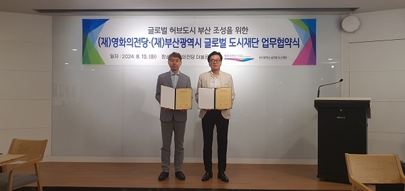 영화의전당이 13일 부산글로벌도시재단과 글로벌 허브 도시 조성을 위한 업무협약을 체결했다고 밝혔다. 협약식은 영화의전당 더블콘에서 열렸으며, 김진해 영화의전당 대표이사와 전용우 부산글로벌도시재단 대표이사를 비롯한 양 기관 관계자들이 참석했다.