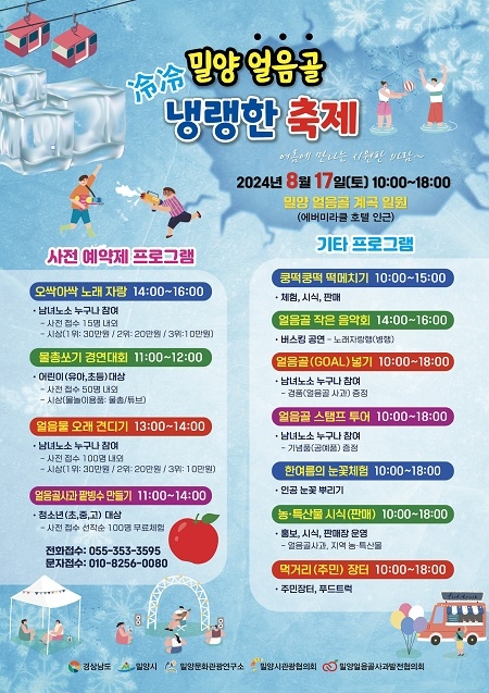 이번 축제는 △경품 가득한 얼음골 스탬프 투어 △모두가 즐거운 오싹아싹 노래자랑 △가슴을 울리는 통기타가 함께하는 작은 음악회 △전국에서 가장 맛있는 얼음골 사과로 팥빙수 만들기 △한여름의 하얀 눈꽃 체험 △물총 쏘기 △얼음물 오래 견디기 대회 등 더위를 한 방에 날려버릴 이색 오감 만족 이벤트가 풍성하다.