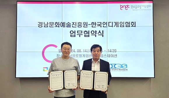 경남문화예술진흥원은 한국인디게임협회와 14일 경남글로벌게임센터 게임스테이션에서 업무협약을 체결했다.