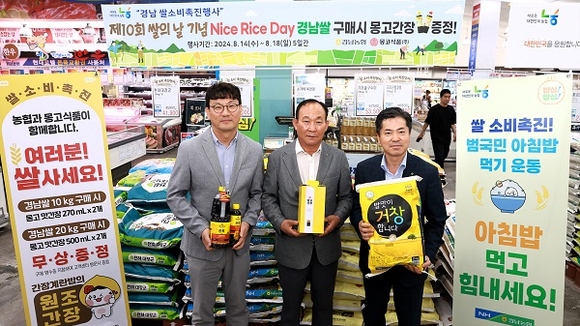 경남농협은 지난 14일 몽고식품㈜과 함께 올해로 10번째 맞는 쌀의 날(8.18)을 기념해 하나로마트 창원점에서 경남 쌀 소비촉진 행사를 펼쳤다.