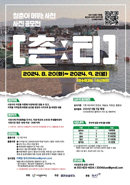 사천문화재단은 '2024 BAT로스만스와 함께하는 청년문화예술지원사업' 일환으로 '[촌:티] 청춘이 머무는 사천'이라는 주제로 사진 공모전을 개최한다고 21일 밝혔다.