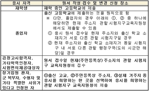 응시 자격에 따른 원서 작성과 접수, 변경 신청 장소는 다음 표와 같다.