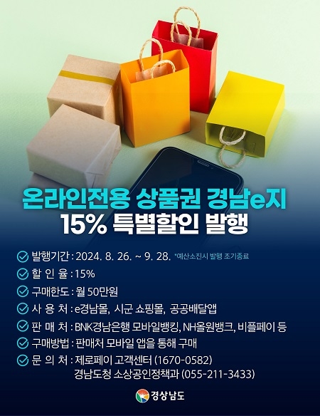 경남e지는 오는 26일 오전 9시부터 9월 28일 오후 6시까지, 1인 월 최대 50만 원 한도로 구매할 수 있으며, 최대 7만 5천 원의 할인 혜택을 받을 수 있다.