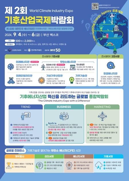 이번 ‘2024년 기후산업국제박람회’는 기후위기 대응을 위한 글로벌 기후·에너지 분야의 국가 대표행사로 부산 BEXCO에서 9월 4일에서 6일까지 3일간 개최될 예정이며, 11개의 컨퍼런스와 500개 이상의 기업이 참여하는 전시행사 그리고 50건 이상의 부대행사로 구성돼 있다.