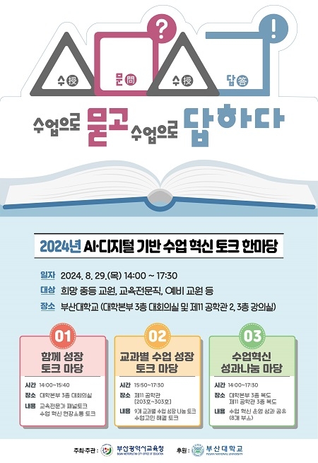 부산시교육청이 오는 29일 부산대학교에서 중등 교원, 교육전문직, 예비 교원, 대학교수 등 교육전문가 300여 명을 대상으로 ‘2024 수문수답(授問授答, 수업으로 묻고 수업으로 답하다) 수업 토크 한마당’을 개최한다고 밝혔다.
