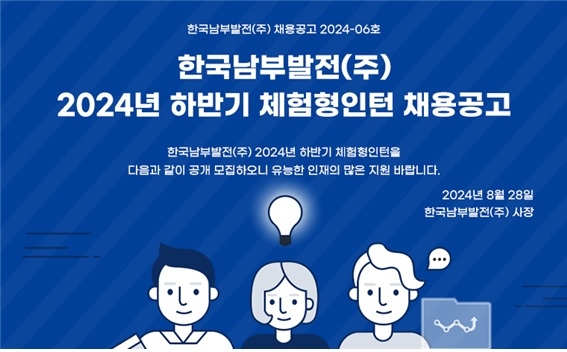 한국남부발전이 2024년 하반기 체험형인턴을 34세 이하 청년 대상으로 총 70명을 모집한다고 밝혔다.
