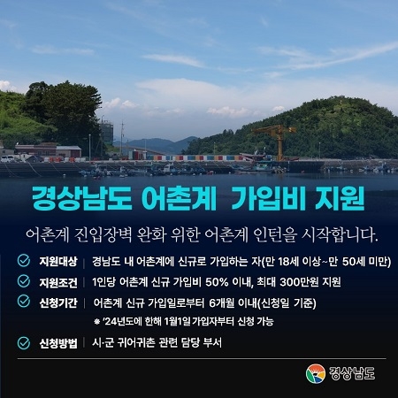 어촌 생활에 관심이 많아 어촌으로 이주·정착하고 싶어도, 어촌계 거주기간 등 가입조건과 높은 가입비로 어촌사회 정착하는 데 어려움을 겪는 경우가 있었다. 이에 경남도는 50세 미만 청년의 어촌계 가입비 절반을 지원해 어촌에 안정적으로 정착할 수 있도록 도울 계획이다.