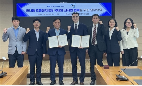 한국남부발전이 지난 29일 부산 본사 대회의실에서 남부발전 심재원 기술안전부사장, 에이치투 한신 대표이사 등 관계자가 참석한 가운데 바나듐 흐름전지 에너지저장시스템(ESS) 국내·외 신사업 협력을 위한 업무협약을 체결했다고 밝혔다.