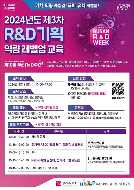 부산과학기술고등교육진흥원(BISTEP)이 오는 25일 지역 연구자 및 R&D사업 담당자의 기획 역량 제고를 위해 부산시티호텔에서 ‘제3차 R&D기획 역량 레벨업 교육’을 실시한다고 4일 밝혔다.