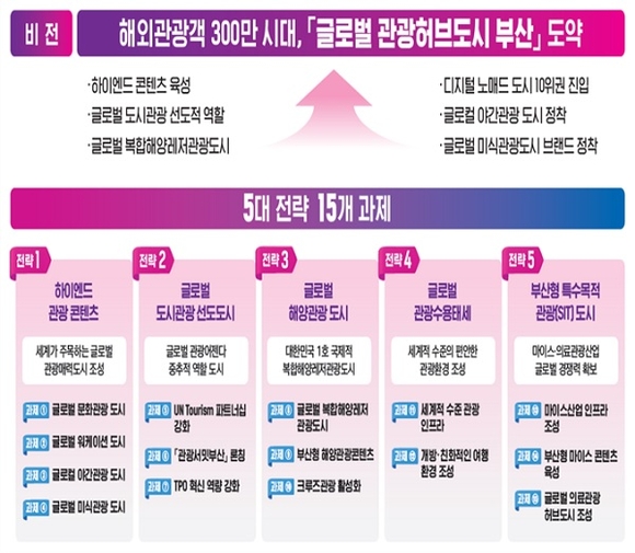 부산시는 이러한 성장세를 이어가기 위해 지난 8월 13일 '글로벌 관광허브도시 도약' 비전을 발표하고, 오는 2026년까지 외국인 관광객 300만 명 시대를 열겠다는 목표를 제시했다. 시는 비전 달성을 위해 5대 전략과 15대 과제를 차질 없이 추진하며, 문화와 관광을 융합한 고품격 콘텐츠 개발과 관광 기반 시설 확충에 박차를 가할 계획이다.