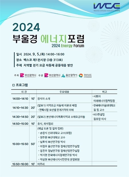 이번 포럼은 부울경 초광역경제동맹의 일환으로, '지역별 전기요금 차등제'에 대한 이해도를 높이고, 에너지분권 실현 등 지역경제 활성화를 위한 정책방향을 모색, 공론화하고자 마련됐다. 특히, '2024 기후산업국제박람회(WCE)'와 연계 개최해 시너지 효과를 도모한다.