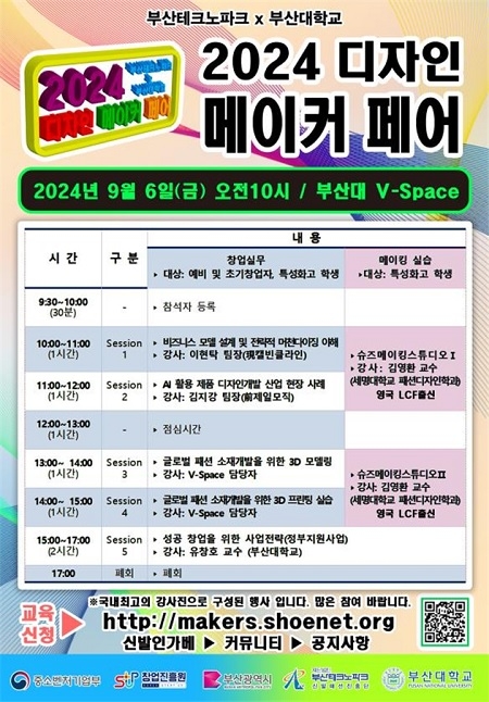 '2024 디자인 메이커 페어' 강연은 비즈니스 모델 설게 및 전략적 머천다이징 이해(캘빈클라인 이현탁 팀장), AI 활용 제품 디자인개발 산업 현장 사례(前 제일모직 김지강 팀장), 글로벌 패션 소재개발을 위한 3D모델링/프린팅 실습(V-Space 담당자), 성공창업을 위한 사업전략(부산대 유창호 교수)으로 국내 최고 강사진으로 구성됐다.