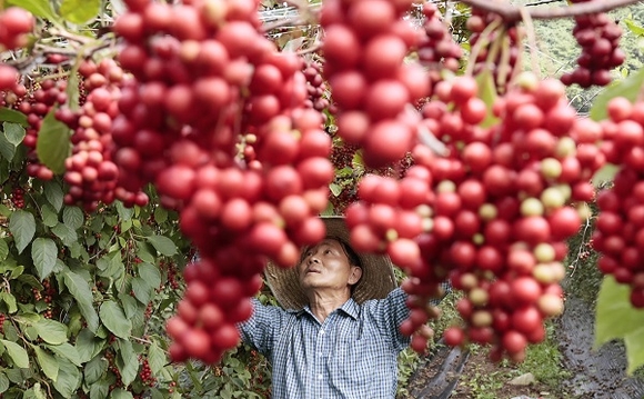 9일 경남 함양군 백전면 백운리 해발 600m 노지 오미자밭에서 박영준씨가 빨갛게 잘 익은 새콤달콤한 오미자를 수확하고 있다. 군은 오는 21, 22일 양일간 백전면사무소 앞 다목적광장에서 '제9회 지리산함양 백전오미자축제'를 개최한다. (사진=함양군 제공)