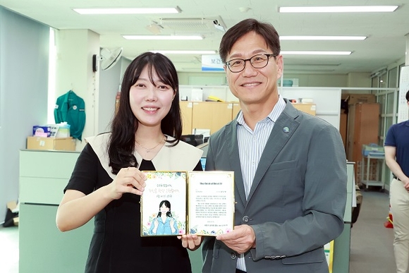 '사천시 제1회 베스트 공무원'으로 선정된 김나린 주무관(왼쪽)이 김성규 부시장으로부터 상장을 전달받은 뒤 기념촬영을 하고 있다. (사진=사천시 제공)
